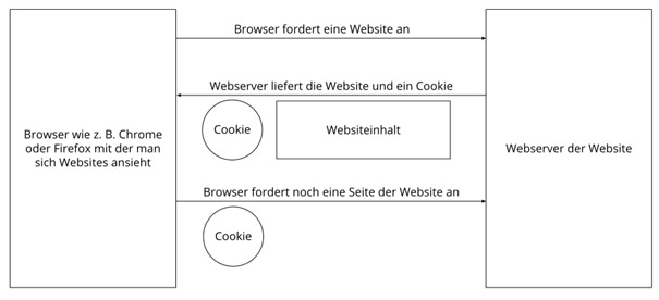 Die folgende Grafik zeigt eine mögliche Interaktion zwischen einem Webbrowser wie z. B. Chrome und dem Webserver. Dabei fordert der Webbrowser eine Website an und erhält vom Server ein Cookie zurück, welches der Browser erneut verwendet, sobald eine andere Seite angefordert wird.