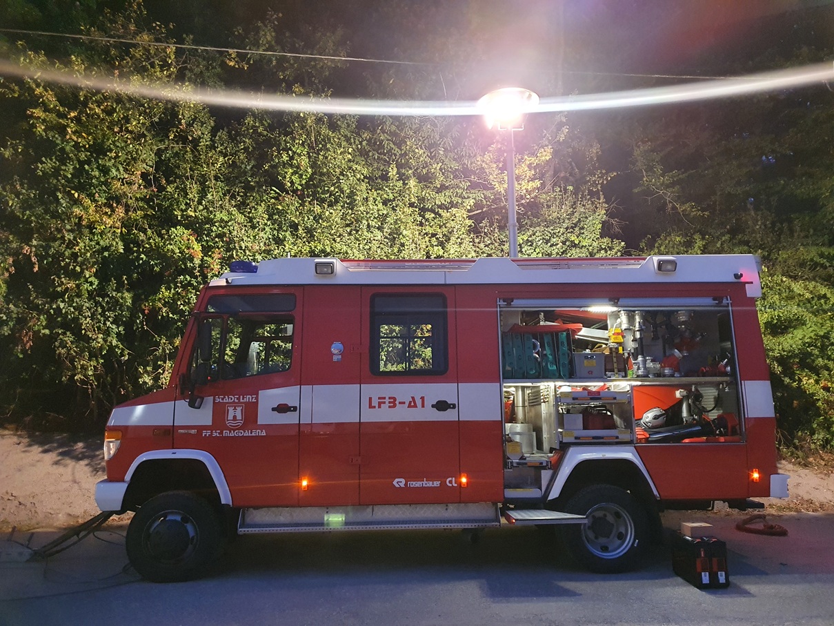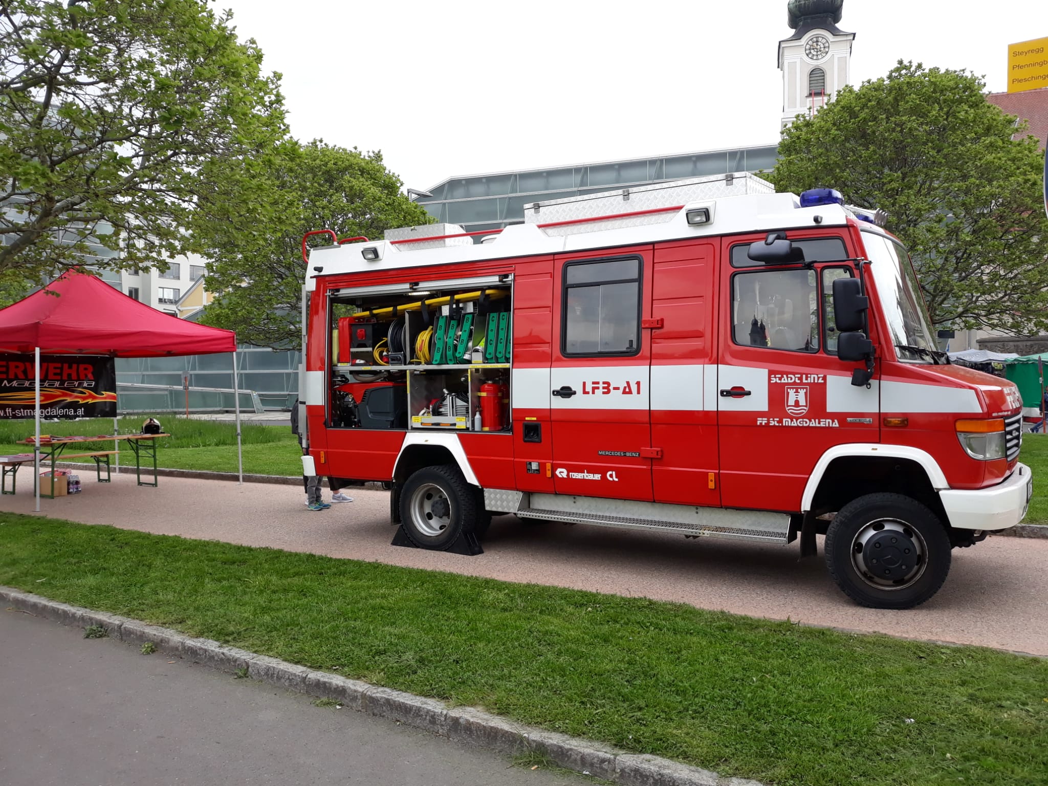 Ein Löschfahrzeug (LF) ist ein Fahrzeug, welches vor allem zur Brandbekämpfung und zur Löschwasserförderung zum Einsatz kommt. A1 weist auf den permanenten Allradantrieb und auf die kleinere der beiden Bauvarianten hin. Das Fahrzeug ist mit einem eingebauten Notstromaggregat, einer Tragkraftspritze und mit Atemschutzgeräten ausgestattet. Zusätzlich sind neben den Feuerwehrschläuchen für lange Wegstrecken noch viele technische Geräte mit an Bord.